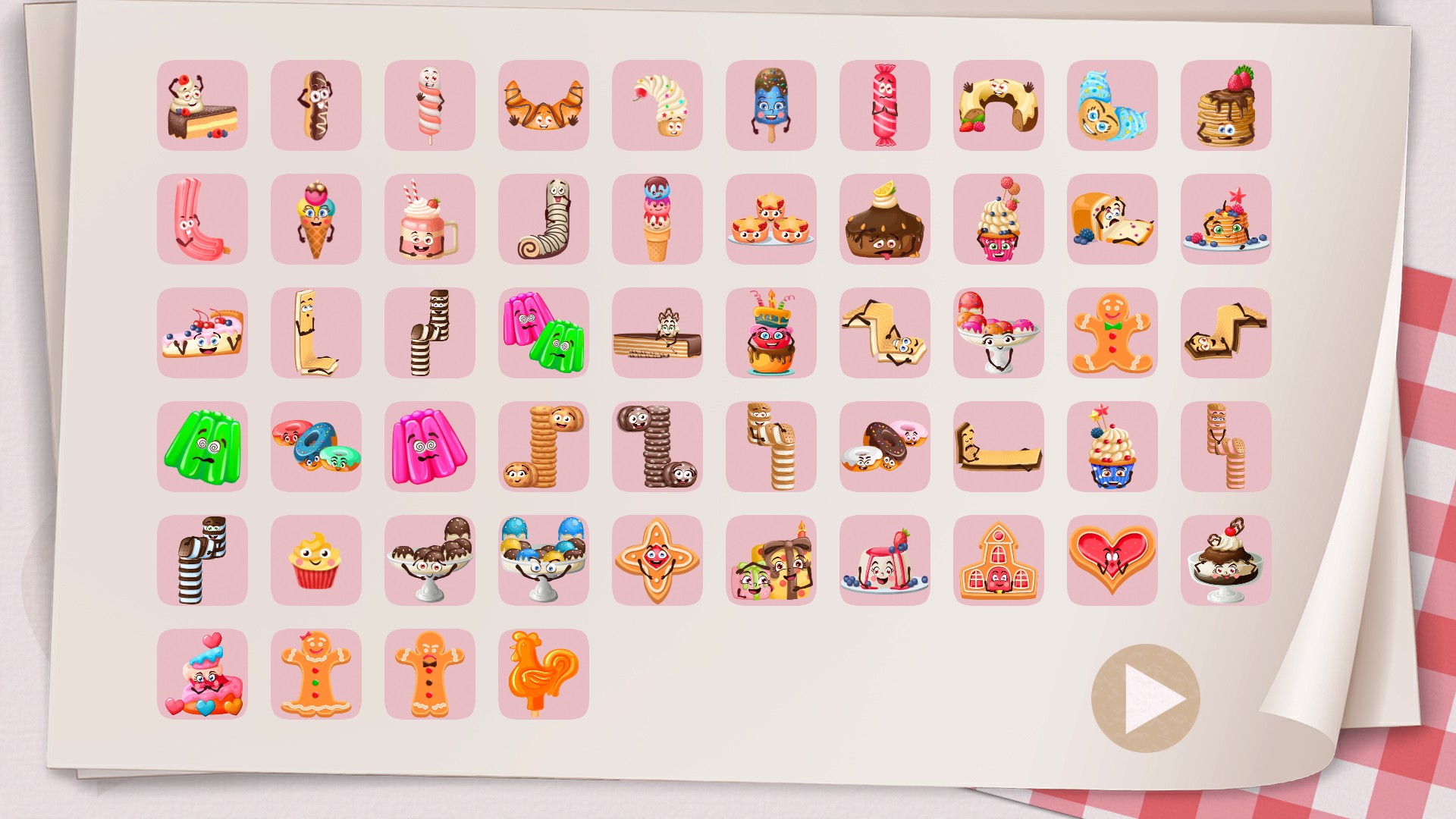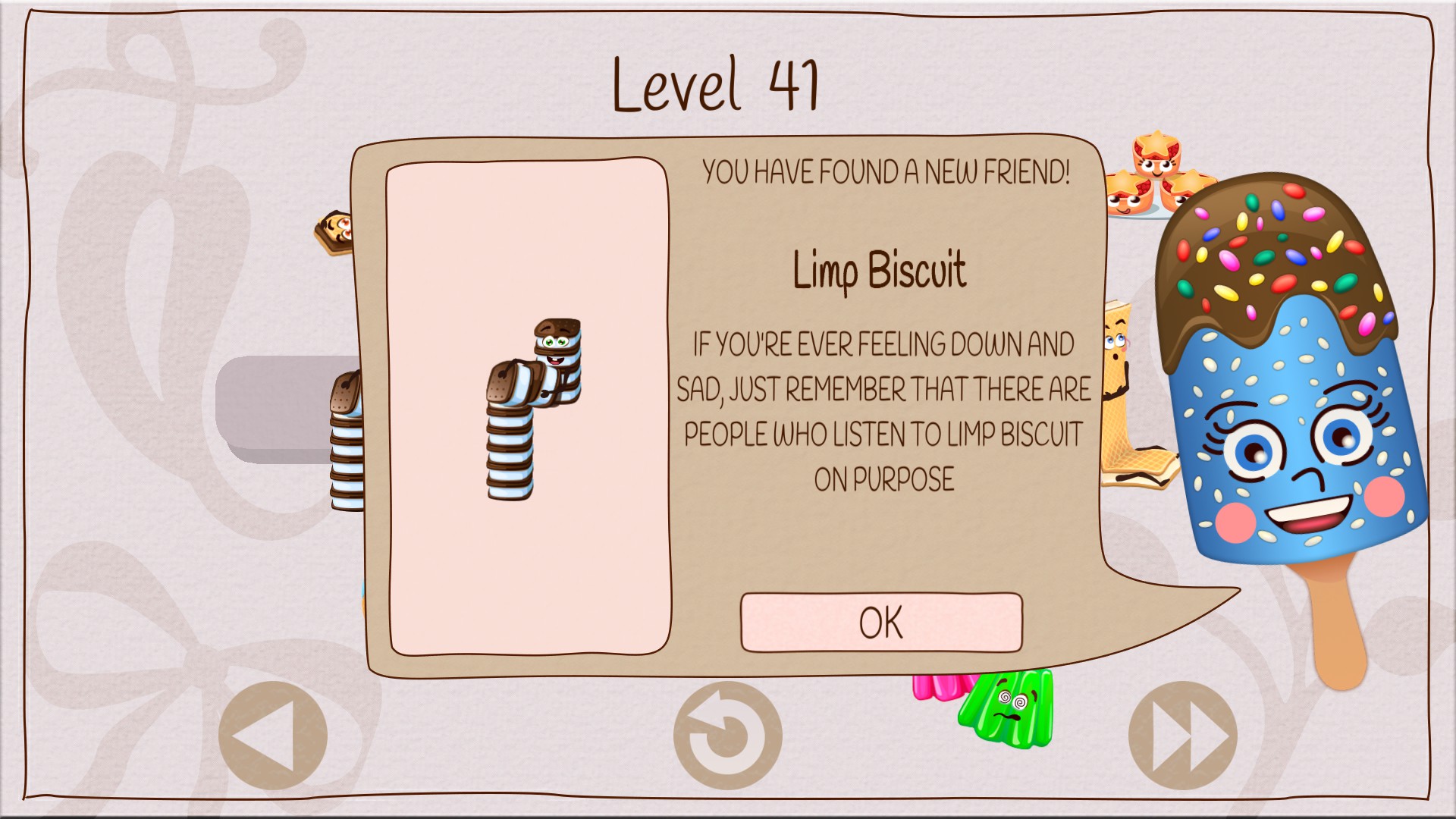 Each new piece is presented with a short and hilarious text at the beginning of the level when you first encounter it, and is then unlocked into a collection that can be accessed from the main menu. All the drawings are very sweet and the pieces all have unique animations while being idle, or when they are picked up / dropped.