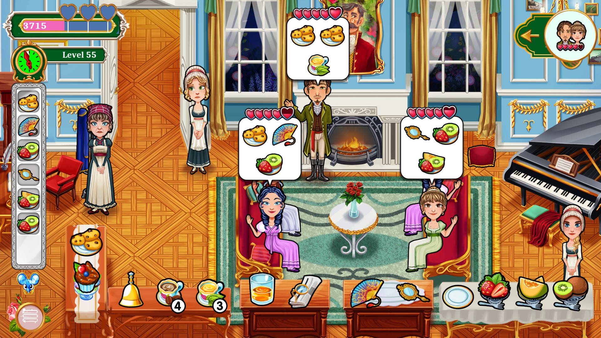 As far as the gameplay goes, it’s mostly like in any other GameHouse game. You’ll have to serve various items or cooked dishes to your visitors, cleaning their tables afterwards and cashing in their payments. Compared to other games, Secret Diaries: Manage a Manor has only a few items that require a timer, and restocking ingredients is a one click-operation. This, together with the fact that the minigames are unique per location, and that changing to a new location happens only once several levels makes the game somewhat easier than the rest. The player has thus enough time to learn the item placement in one location before jumping to another, and the fact that you know in advance what kind of minigame you’ll get also helps keep up the focus and pacing. Additionally, there’s also a visual hint a few seconds before the minigame will trigger which also helps you prepare for the fast clicking that it requires. Overall, I find Secret Diaries: Manage a Manor to be a well-balanced game in that regard, allowing it to provide longer levels than usual (or at least to me they seemed to take longer than in other games, around 7 minutes each). Side objectives and the collectible mouse that pops up from time to time are features consistent through all GameHouse games, and they are obviously encountered here too.