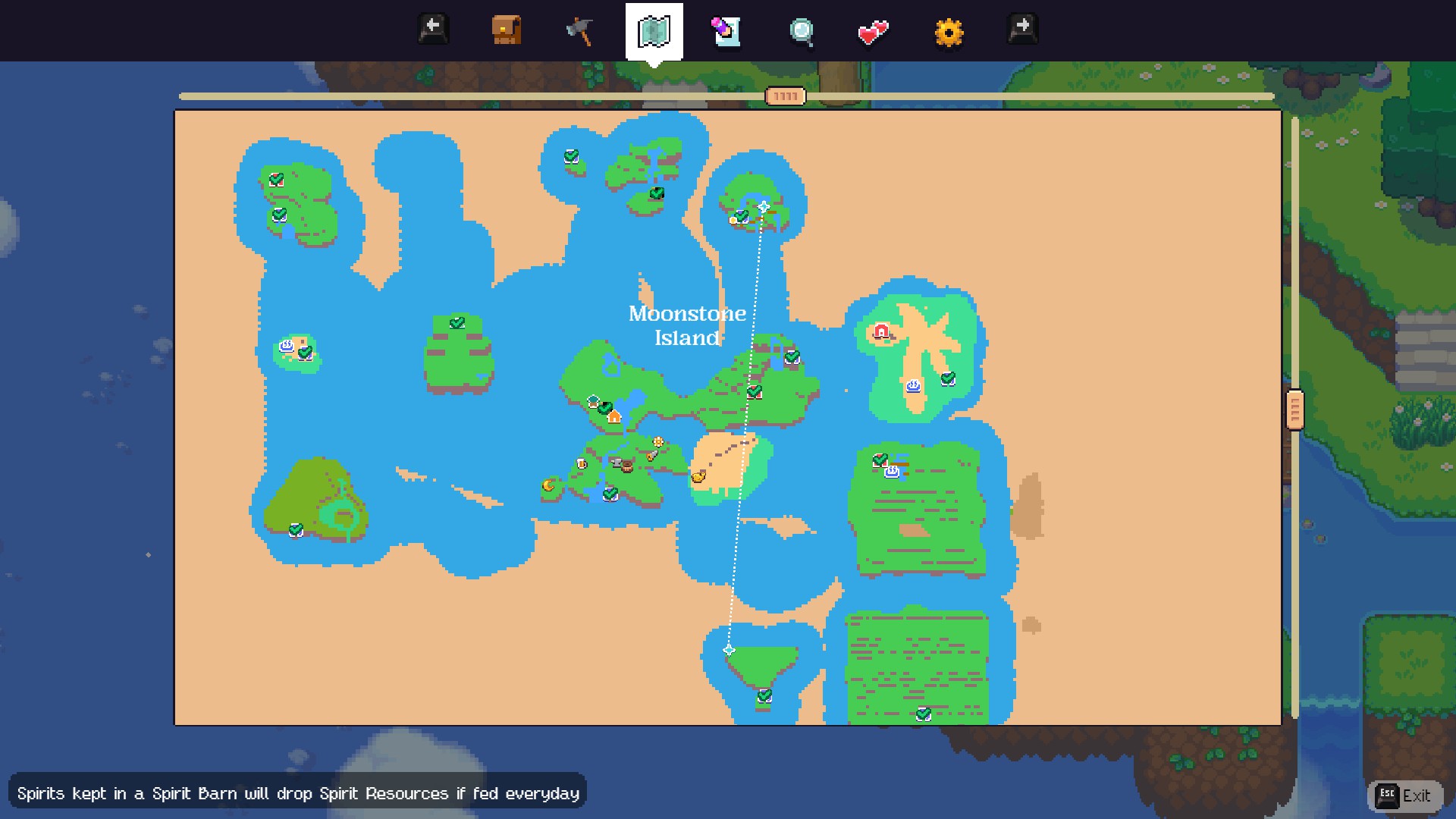 Each of these two aspects of the gameplay has its own strengths and weaknesses. For instance, the crafting part is very straightforward, requiring only a couple of steps even for more complex items. The tools don’t have that annoying durability mechanic that requires you to always craft a new one every few days. The plants require daily watering (aside from rainy days), but the watering can doesn’t ever need to be filled and besides, you can just craft sprinklers to water your plants automatically. There are plenty of basic resources to gather (although trees and grass don’t automatically respawn) and the mines that you can open on each island are rich in minerals, chests that drop blueprints, and spirits to tame. On the other hand, a lot of the items required for progression (such as the barn or essential flying items) are gated behind the acquisition of Moonstones. Up until close to the endgame where you get a blueprint to mass-produce them, likely for transitioning into a sandbox kind of gameplay, these are extremely rare: each island contains only one per season, and very few bosses or chests drop any. Due to their scarcity, the progression is extremely slow, and exploring as many islands as possible quickly becomes your main goal. This in turn requires you to be able to fly greater distances (to reach further islands) and to be equipped to fight any enemies that you might find there.