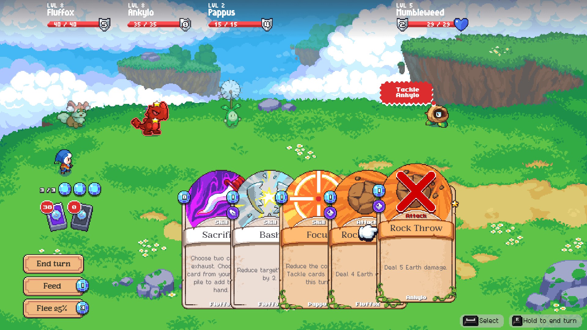 In regards to the deckbuilding aspect, you get to expand your deck by one random card (chosen out of three possible ones that the game offers) every time you level your pet. Upgrading or removing a card is possible, however you will need special tokens for that, which are also quite rare (you can find one every few islands). Thus, while the battles are really fun, the deckbuilding mechanic is rather restrictive, as you don’t have full flexibility in customizing your deck. Moonstone Island also offers 30 rather lengthy, yet very exciting dungeons, where you get to solve little puzzles, uncover chests and fight higher-level spirits.