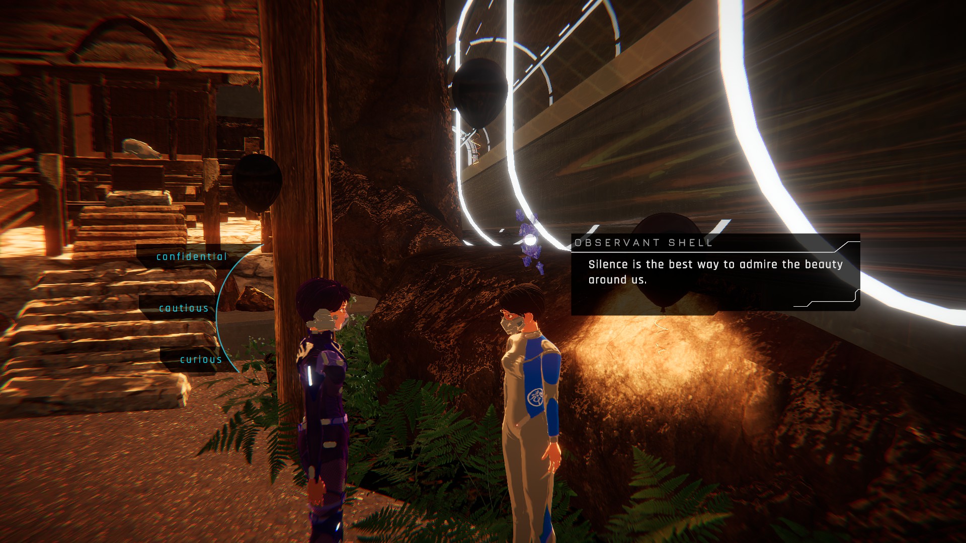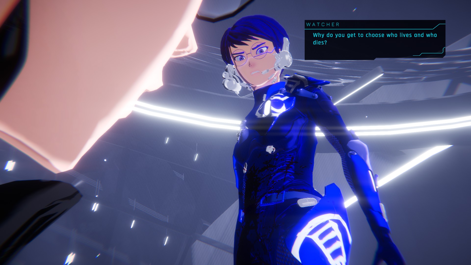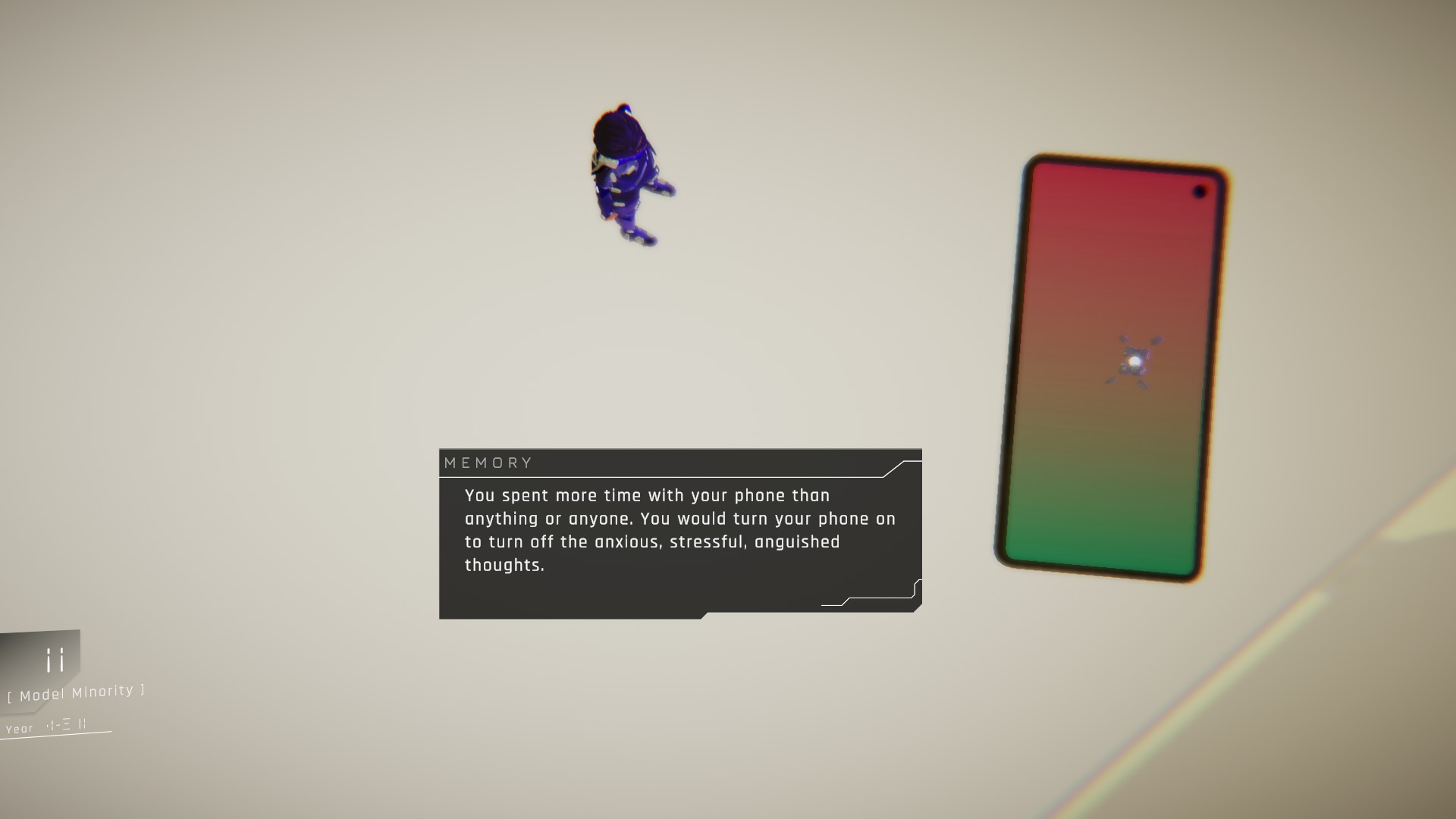 1000xRESIST is a game that is hard to fit in any box. It plays like a walking simulator, but the environments are not really created to be explored and despite them being visually appealing, their purpose isn’t to divert the player’s focus from the story, but to support the immersion. Due to the amount of dialogue and the choices you can make during conversations, it also plays as a 3D visual novel. In some ways, it can also be seen as a narrative-driven linear adventure game stripped of any puzzles. Only one type of minigame exists, in which Watcher teleports from node to node (similar to using an invisible zip line) until she reaches a specific location that triggers a memory. This minigame occurs several times throughout the game but only one instance is timed, and it has a very generous timer. If I were to describe the game in a nutshell, I’d say that 1000xRESIST is a walk-n-talk adventure with light puzzling, perhaps similar to Telltale games or Life is Strange.