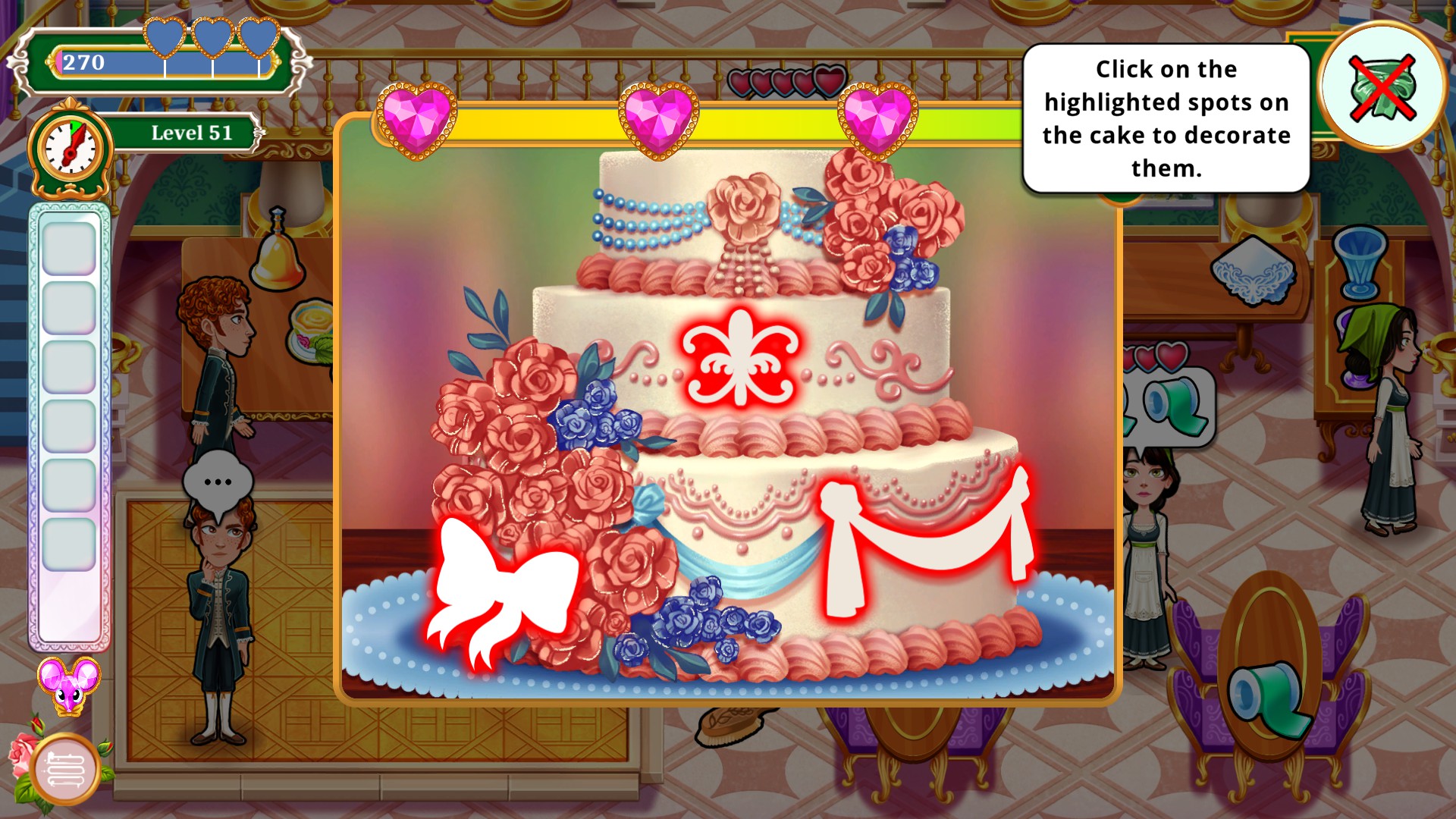 Secret Diaries – Royal Wedding is told from the perspective of Emily (to not be confused with the Emily from the Delicious series) – Jane’s maid who she befriends in the first game because of their similar backgrounds and dreams. Emily is tasked with dealing with all the issues that come up during the preparation of Jane’s wedding, while also trying to find her place in high society. As Jane’s maid, she is treated by the majority of the guests as an errand girl, but as a close friend of Jane, she expects to be asked to be her bridesmaid, which might not be appropriate due to her commoner status. The obstacles she encounters are made even more difficult due to her not being in a position of power, thus not being taken seriously or in any way as a priority. Compared to other GameHouse games, the inner struggles of the protagonist seem intensified and more clearly fleshed out. But, as it is still a GameHouse game, the story maintains a constant heartwarming vibe and soon enough Emily receives some well-deserved support from two kind characters and also falls in love.
