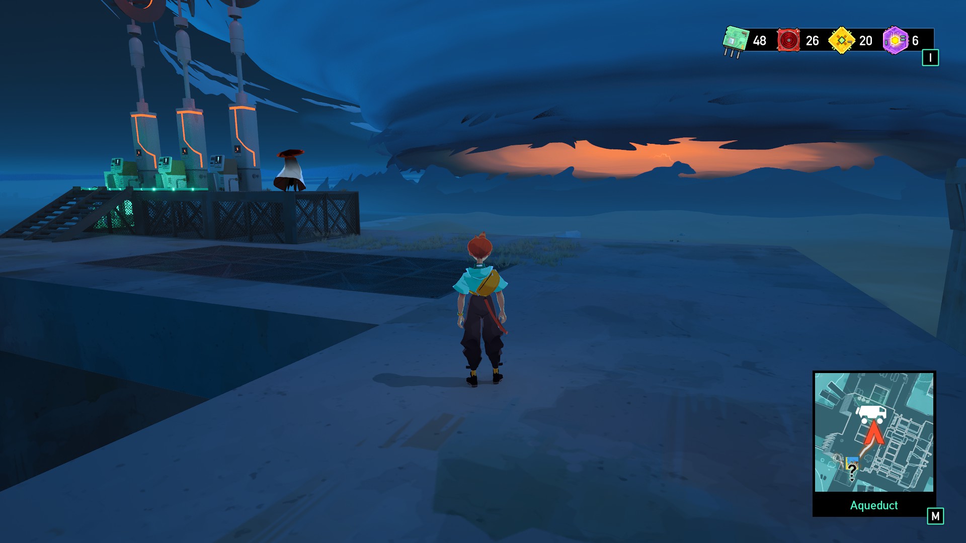 Caravan SandWitch’s gameplay consists mainly of exploring the wasteland of Cigalo in a cozy, rusty car-a-van and visiting every ruin to collect old computer parts or items needed for quests. The map is fairly small, and after a couple of hours of gameplay, you will have already become familiar with it like the back of your hand. However, the progression is heavily gated by the upgrades you can buy for your van, which obviously require a certain amount / type of computer parts to craft. Thus the gameplay loop boils down to visiting the major locations more or less every time you get a new upgrade (which happens 3-4 times in the game) that allows you to go one level further into the ruins. They’re designed in a linear way, making it very easy for the player to know where to go or what floors are blocked by not having unlocked a certain upgrade yet. The computer parts to collect are very abundant and found everywhere on the map, even outside ruined locations too (thus there will be no grinding for those), yet scattered in a way that motivates you to progressively visit new places. There’s some light puzzling involved in some locations, where you will need to press a button to activate doors and open new paths, but there’s nothing complicated about it, nor anything requiring deep logic.