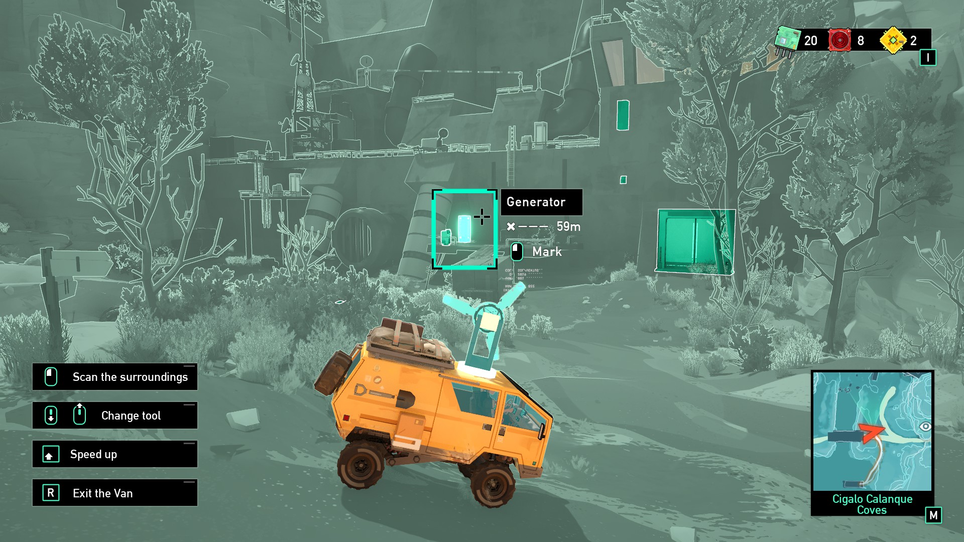 The gadgets you can unlock for your van are very fun to use. Aside from a radar that will highlight all collectible components, doors, generators and other essential game elements within an area around the player, you will further unlock a grappling hook that can be attached to poles located on higher platforms, thus creating a zip line for you to slide up there. This will also be used to uncover hidden containers in the sand or to pull down doors, Mad Max style. With further van upgrades, you will be able to hack platforms and communication terminals, allowing you to read the secret messages that Sauge’s sister tried to send to Cigalo.