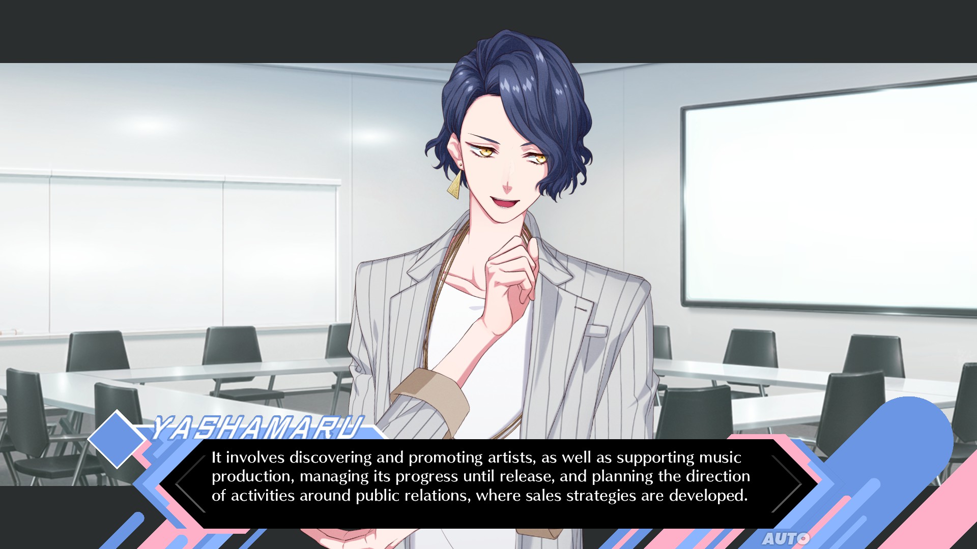 To help the player easily identify them, the logo of their individual group is visible on the side of the dialogue box when a character speaks and their names are also color-matched to their outfits or portraits. The design in this regard is well done, although I felt that one missing element was displaying the connection between their stage name and their actual name, which the player has to always keep in mind as it’s not visible.