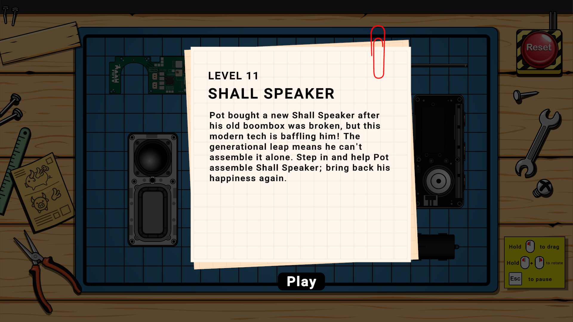 Much of the game’s appeal lies in figuring out the correct order in which pieces should be assembled. One restriction of this mechanic is that even when two parts are compatible, they must be combined in a very specific order. Placing piece A onto piece B might fail, while doing the reverse works just fine. With more abstract devices and unusually shaped parts, the correct arrangement can be difficult to deduce, leading to a fair amount of trial and error. In these cases, it would have helped if the pieces were designed more intuitively (for example, by featuring unique details that make their placement and interaction clearer) or if there were some light textual hints suggesting which pieces belong together. A similar game, Assemble With Care, addresses this issue by dividing levels into multiple stages, only introducing new parts once the previous stage has been completed.