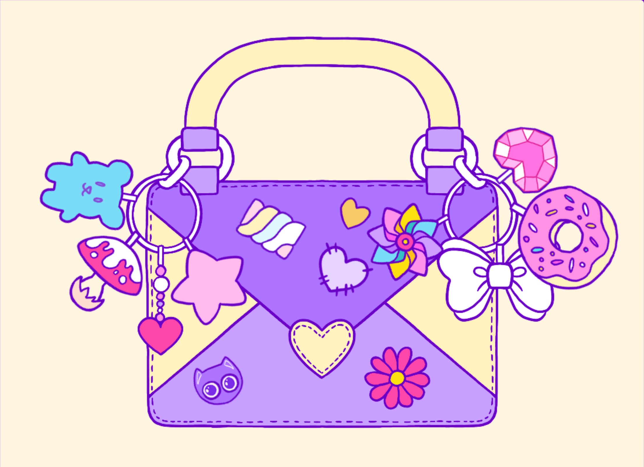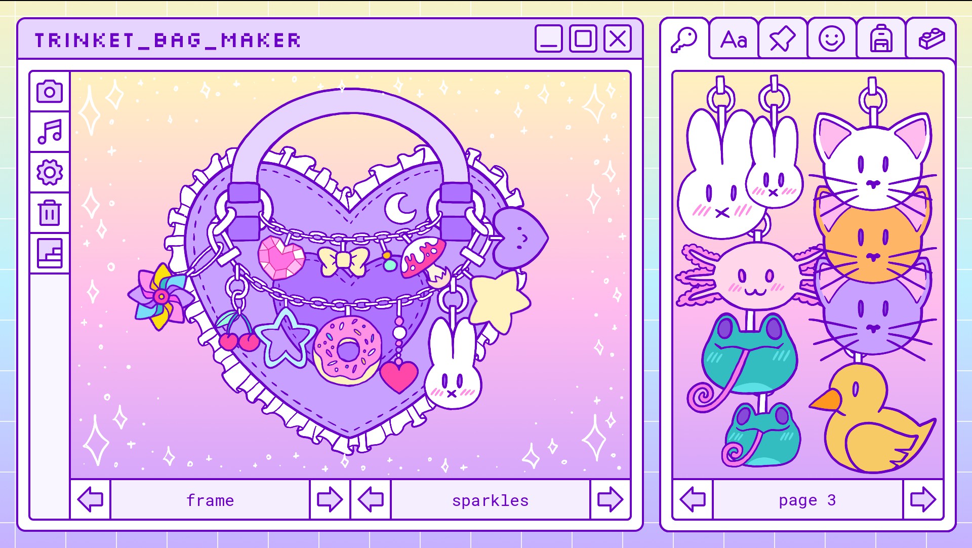 The game features around a dozen bag shapes and several preset color schemes, along with customizable chains to hang your creations on. Each trinket can be rotated, resized, and duplicated; you can also change its layer, making it easy to fine-tune your designs. The only real limitation is that individual elements can’t be recolored. Once your bag is complete, you can take a screenshot, with both the background and frame customizable through several preset options.